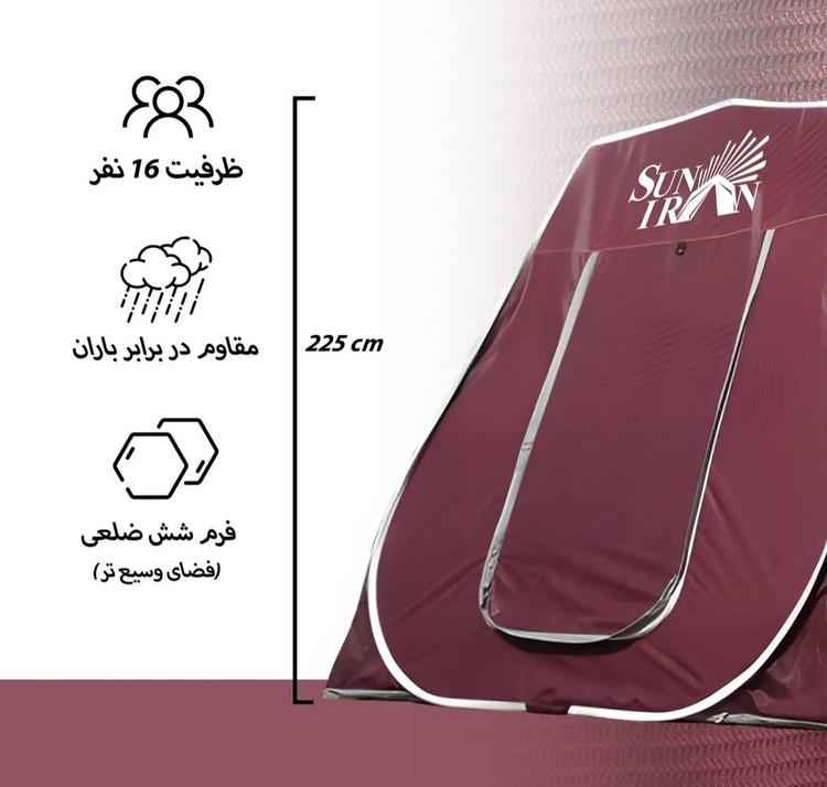چادر مسافرتی فنری کلهاسکلتی ۱۶ نفره یکی از بزرگترین و کاربردیترین مدلهای موجود در بازار است. طراحی ششضلعی و سازه کلهاسکلتی، علاوه بر ایجاد فضای داخلی بزرگ و پایدار، مقاومت بالایی در برابر باد به چادر میدهد.